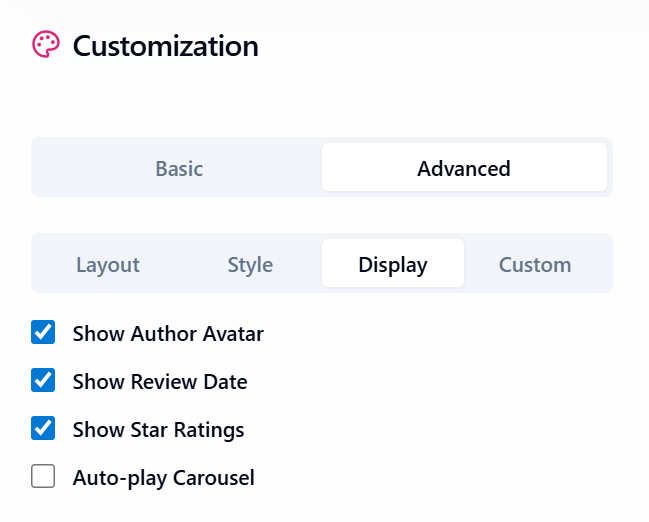 - Display Controls: Show or hide the author avatar, review date, or star ratings. You can even enable auto-play for carousels.