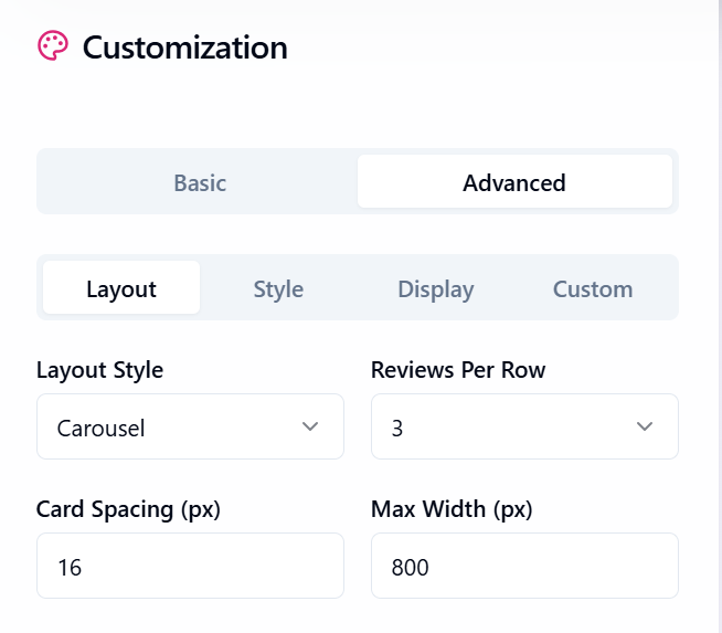 - Layout: Pick from carousel, list, grid, or testimonial styles, adjust the number of reviews shown per row, card spacing, and set the max width.