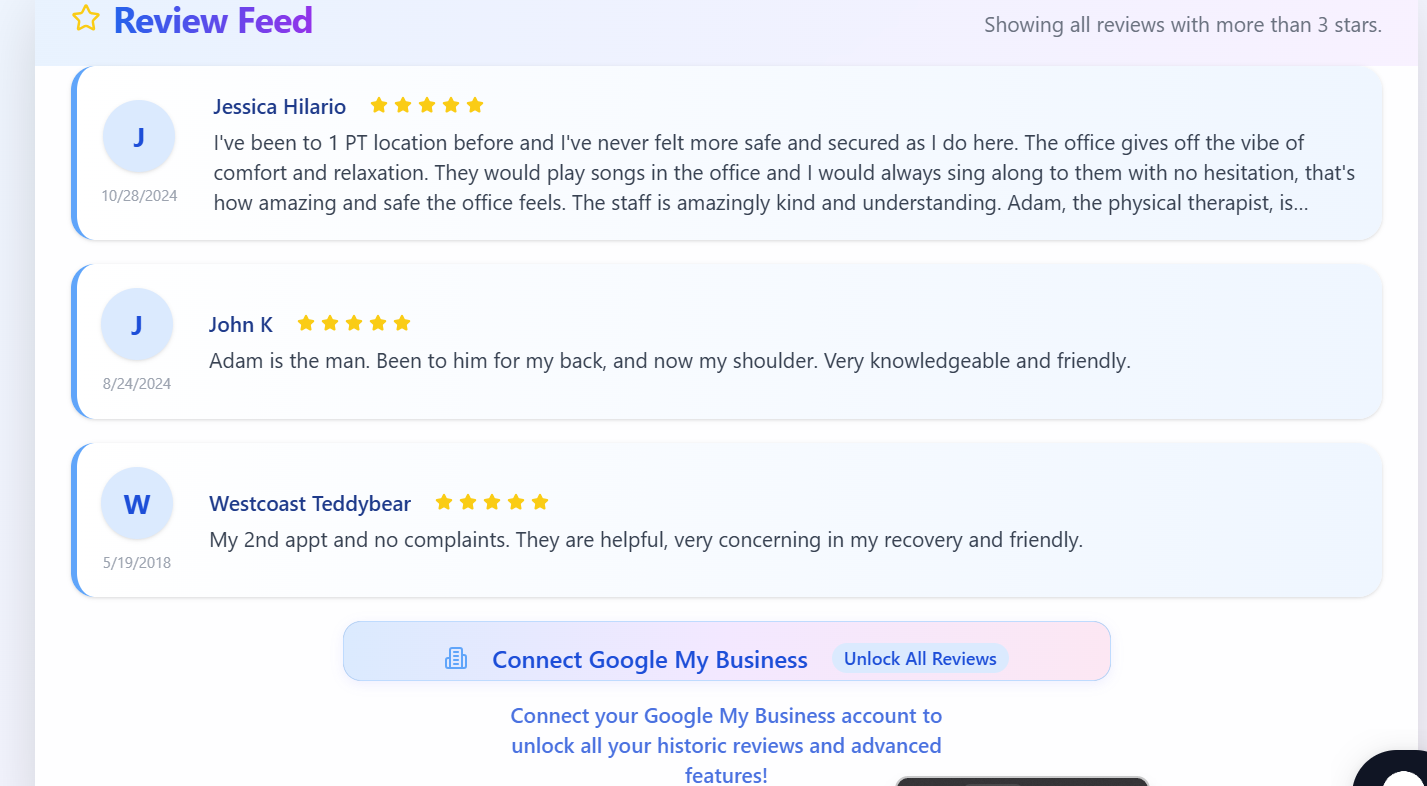 You’ll see your most recent reviews right away, but to display all of your historical reviews, simply follow the on-screen prompt to connect your Google My Business account. Once connected, Review Manager will fetch and display all your reviews in one place.