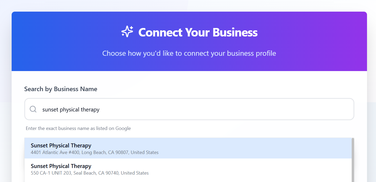 - Select your business from the search dropdown that appears.